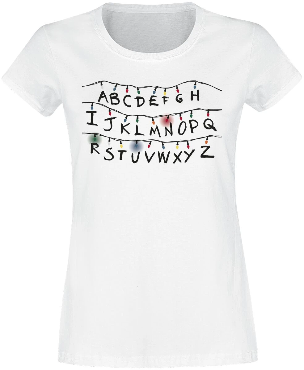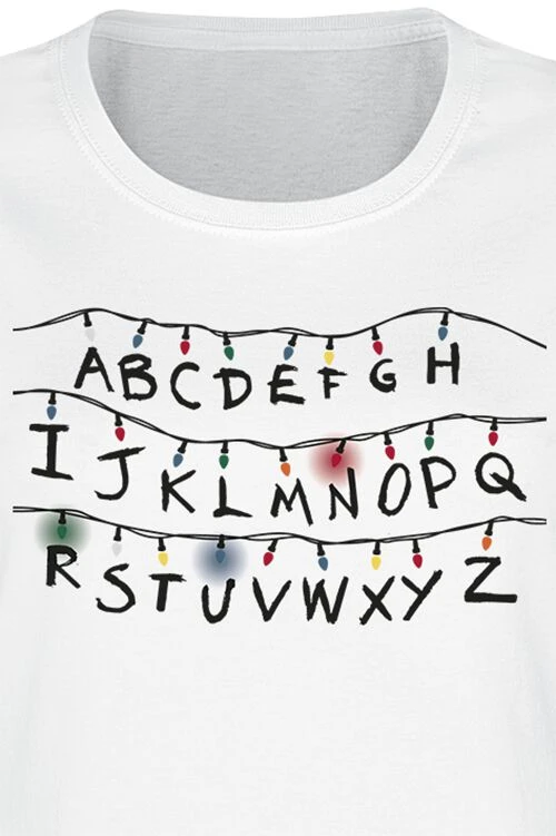 Passend zur ersten Staffel gibt’s bei uns das „Alphabet Lichterkette“ T-Shirt von Stranger Things mit buntem Print auf der Vorderseite. Joyce, die alleinerziehende Mutter von Will und dessen Bruder ist eine echte Powerfrau. In Staffel 1 kommt sie auf die grandiose Idee mit ihrem verschwundenen Sohn mithilfe einer Lichterkette und einem an die Wand gemalten Alphabet zu kommunizieren. Einfach genial, oder?