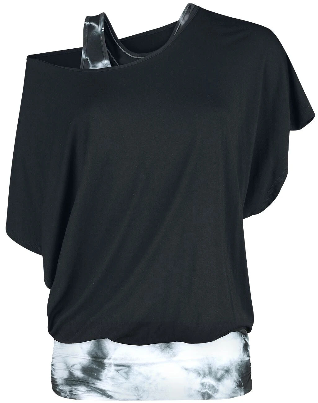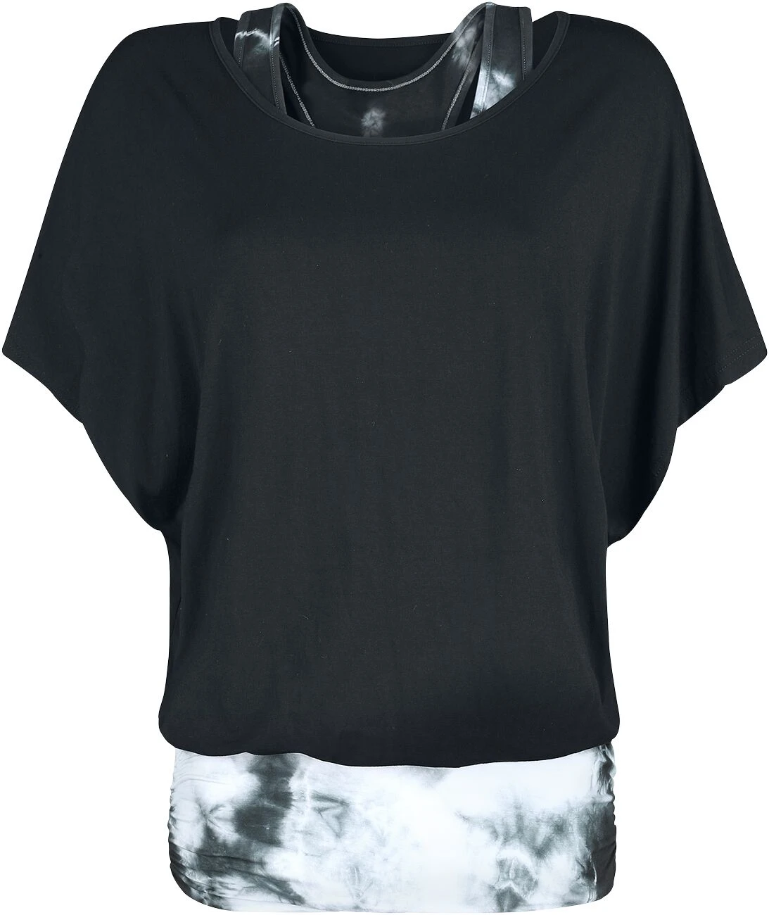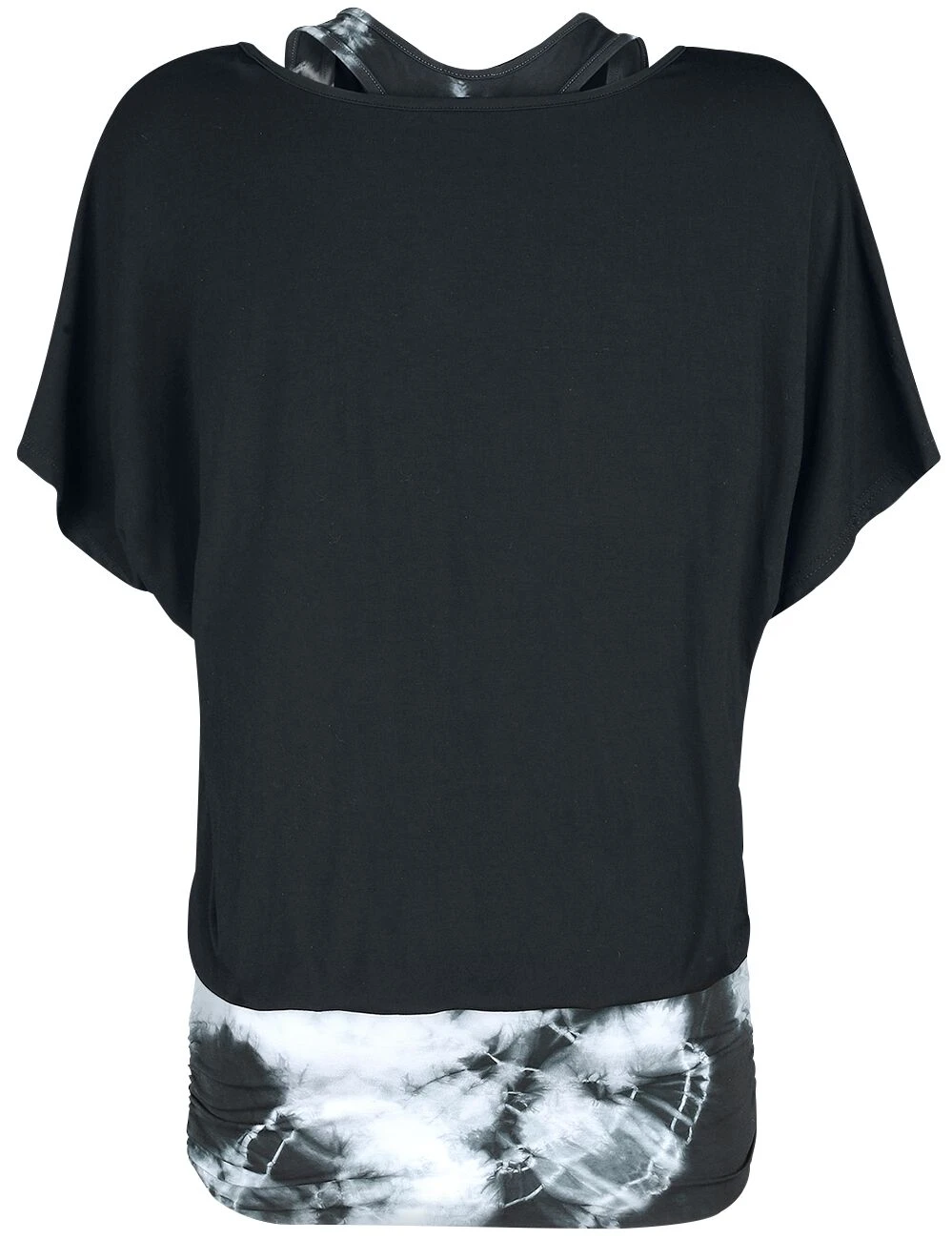 Das Batik Shirt passt super zum lässigen Gothic Look für jeden Tag. Es besteht aus einem körperbetonten Untertop mit weiß-schwarzem Muster und einem weiten, schwarzen Shirt darüber. Die beiden Teile sind zusammengenäht. Kein Exemplar gleicht dem anderen, denn das Batikmuster entsteht zufällig. Das Top passt natürlich auch zu anderen alternativen Modestilen. Das Batikshirt von Fashion Victim besteht aus Viskose und Elasthan.