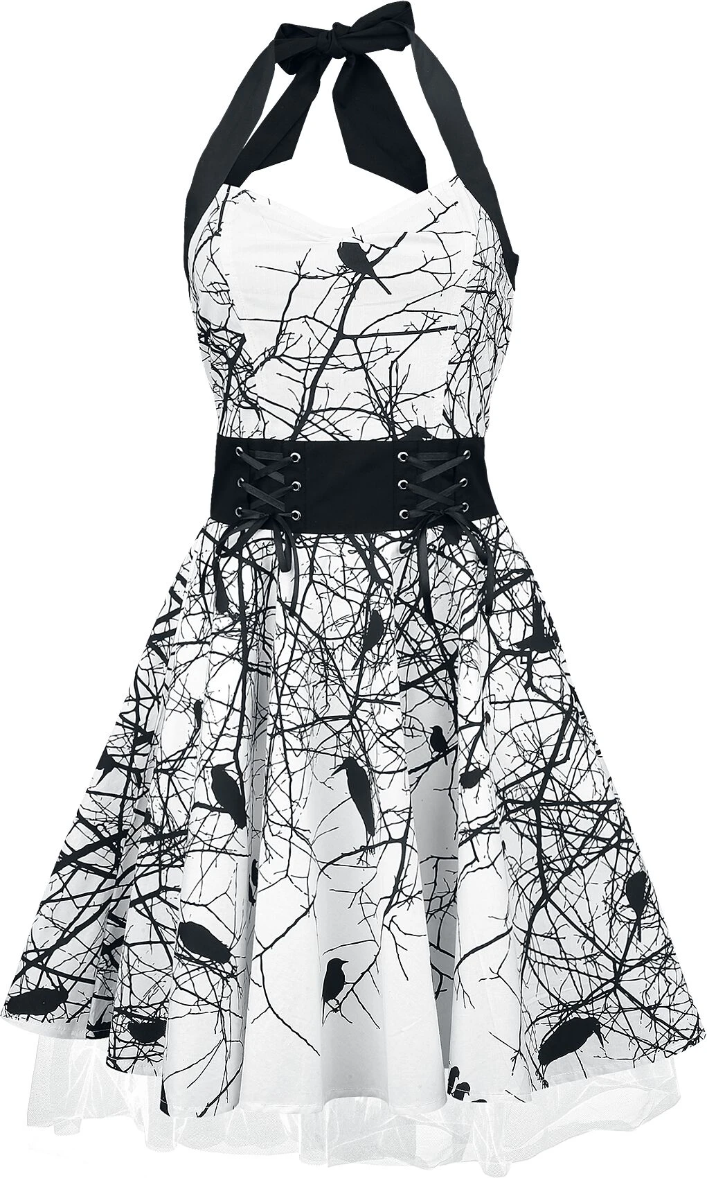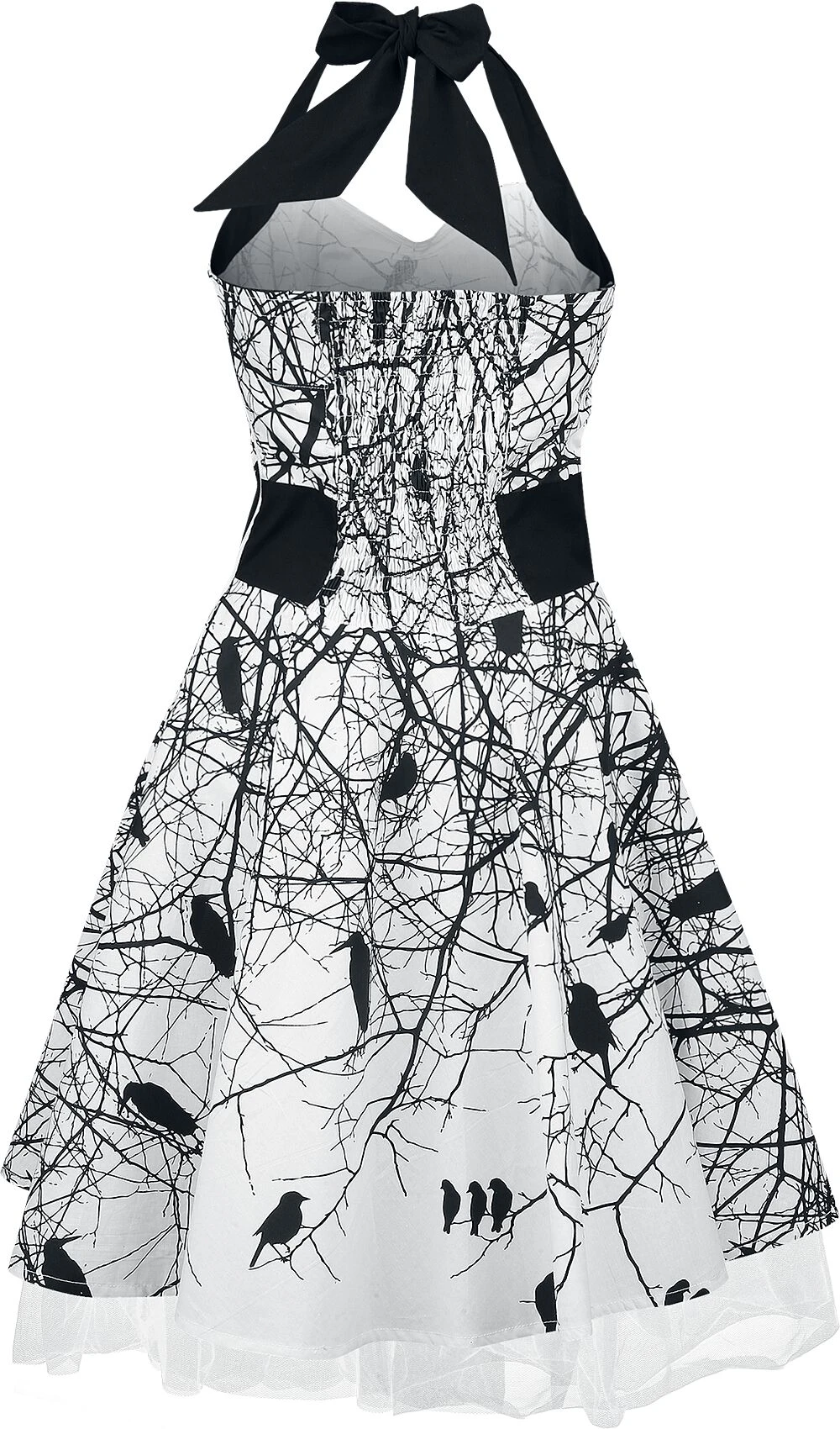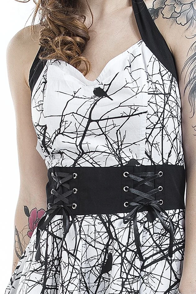 Dark Crow ist ein düsteres Neckholder-Kleid von Vixxsin. Die Schnürungen am schwarzen Waistband halten das von Krähen bevölkerte Astwerk eines toten Baumes zusammen. Ein fast schon poetisches Motiv für das mittellange Kleid mit Tüllabschluss. Irgendwo zwischen gediegen und spacig – oder eben: stylish abgefahren!
