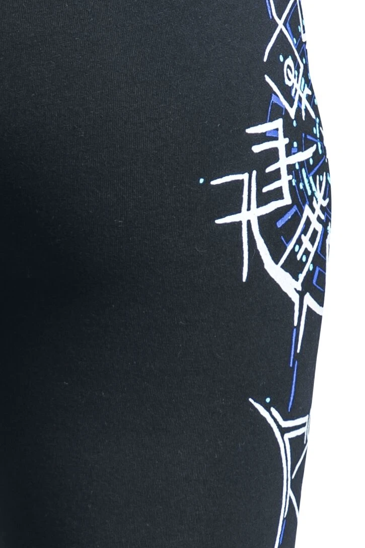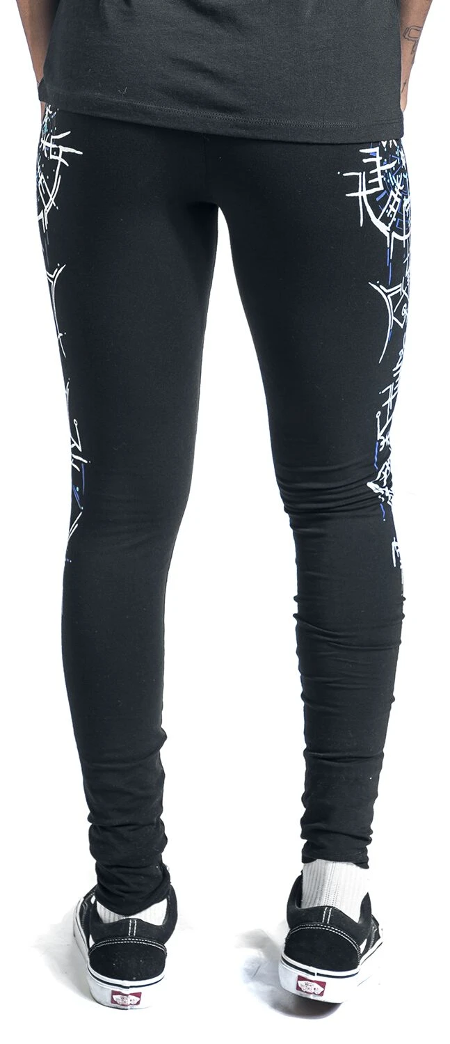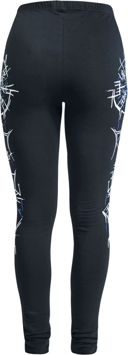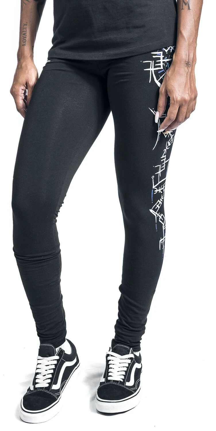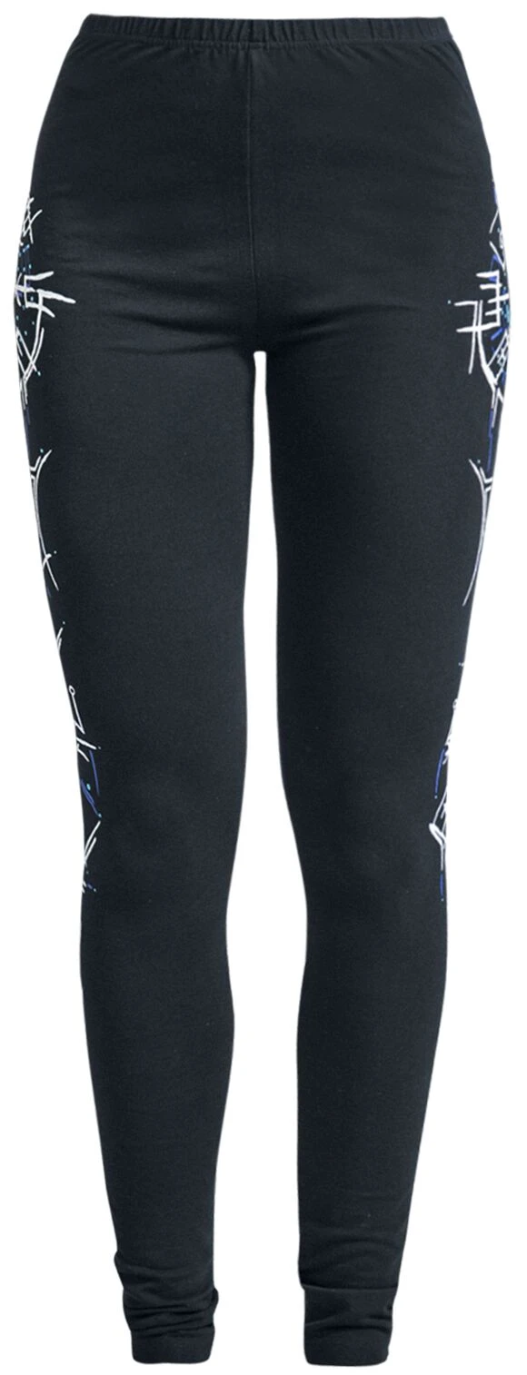 – schwarze Leggings mit großem Print auf den seitlichen Oberschenkeln