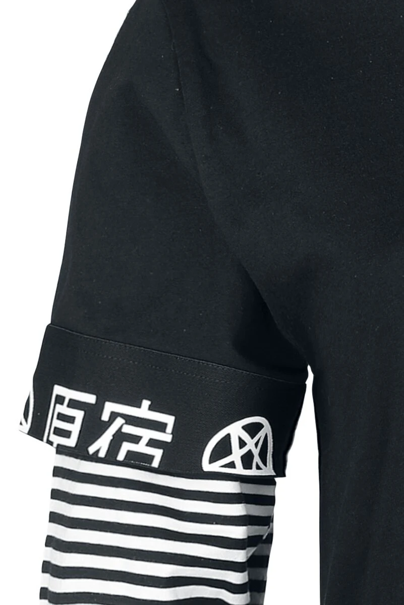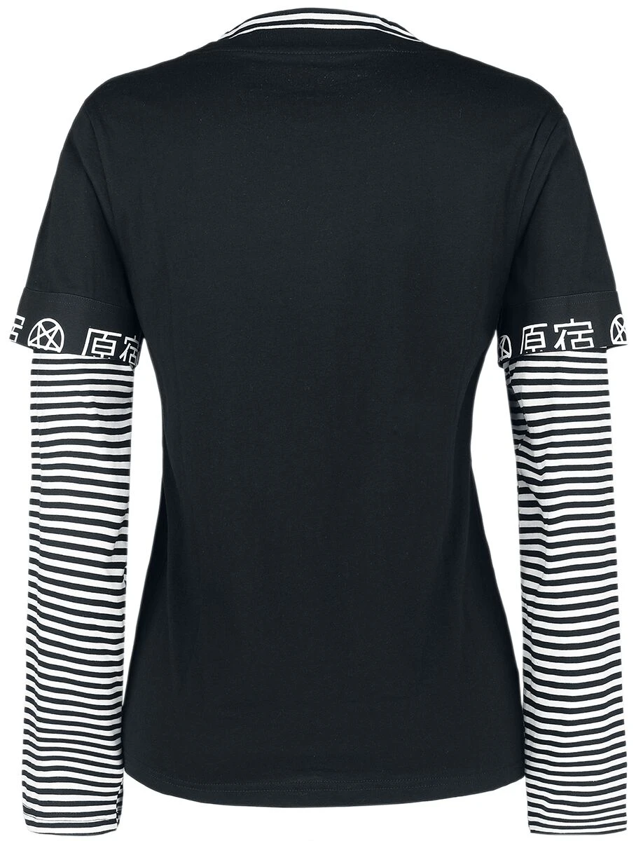 – schwarz- weiß gestreifte Ärmel und kleiner Stehkragen