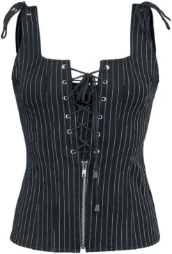 Gönne dir für den Party-Abend einen Hingucker von Gothicana by EMP. Mit dem exklusiv bei uns verfügbaren Girl-Top im Nadelstreifenoptik bekommst du ein neues Schmuckstück, dass im Rücken durch eine Schnürung und im Vorderteil durch einen Reißverschluss an- und ausgezogen werden kann. Cool sind auch die Schnürelemente an Trägern und Saum.